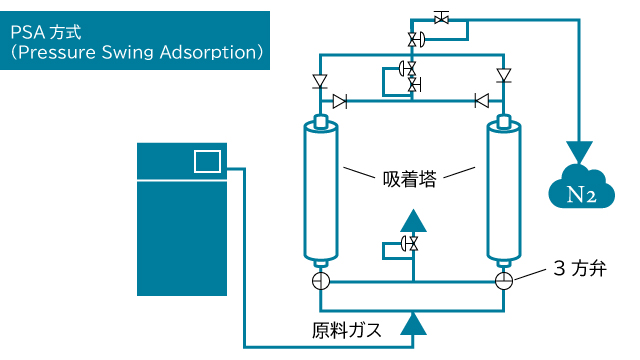 這種透過反覆加壓和減壓進行吸附的方法稱為變壓吸附(PSA)法。我們的氮氣產生器主要採用這種PSA法。而如果您需要方便地使用低純度氮氣,膜分離法是理想之選。