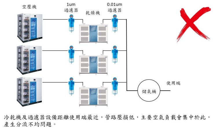 距離使用端最近的空壓機、冷乾機與過濾器因為管路壓損低,主要負載會集中於距離使用端最近的子系統,產生分流不均。