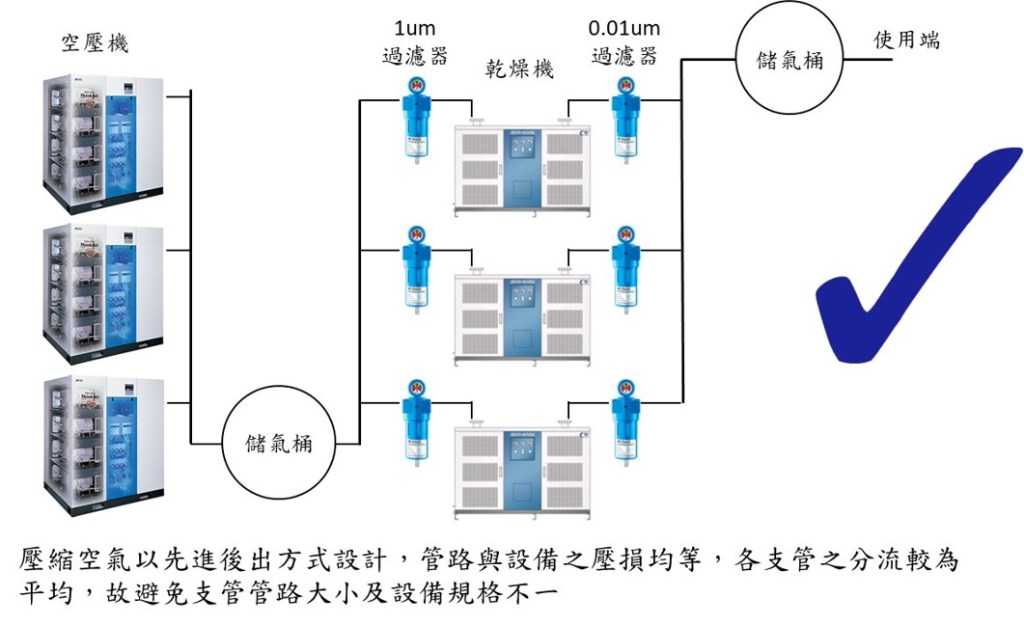 規格一致化: 雖然空壓機可採「大小配」來對應負載變化,但乾燥機與過濾器建議規格一致,以避免因大小壓降不均導致的空氣流動阻塞。