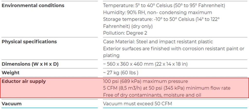 下表是一款實驗室應用的雷射粒徑分析儀,事實上大多數的精密儀器除了風量與操作壓力的需求不太一樣之外,對於壓縮空氣的品質通常都是無水, 無油且符合一定數量固態顆粒的條件, 甚至要求必須無微生物檢出 (Oil Free, Germ Free and Low Dew Point–>Free of dry containments, moisture and oil)。精密儀器既然有用到壓縮空氣, 那肯定會有入口+流道+電磁閥件+關鍵部品+出口, 任何一處遭受汙染難免影響精度!