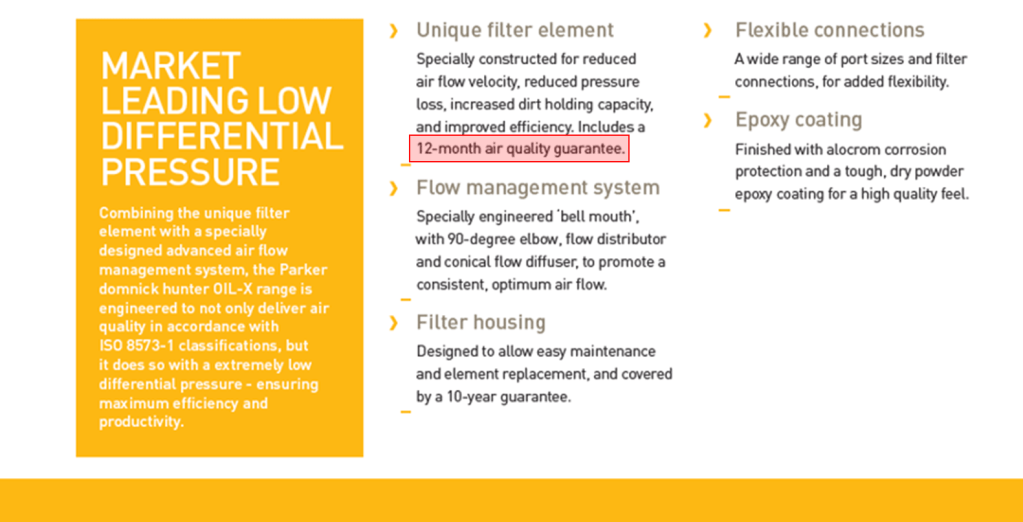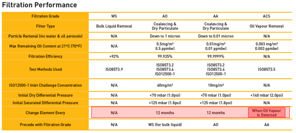 強調過濾器產品提供12個月的濾效保證,但是各位可以看看ACS (過濾潤滑油或空氣含油分的活性碳過濾器並沒有提供12個月的濾效保證) 告訴大家的是何時更換過濾器:當發現有油氣被偵測觀察到的時候。並不是該品牌騙人,因為固態顆粒確實是可以確保被攔阻下來,但是油氣是任何一家品牌過濾器都不敢保證一定時間內是可以完全被擄獲攔阻下來的。