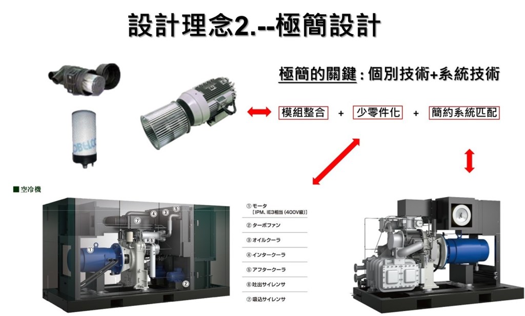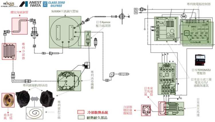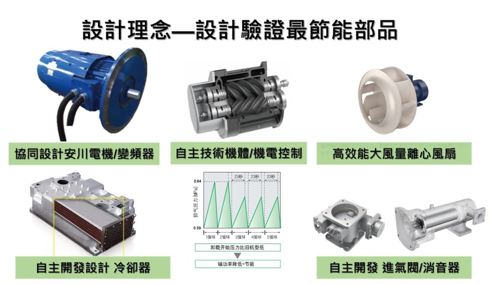 不耗電零件部品的設計優化以及高效率畫開發設計, 讓搭配的耗電零件部品採用相對可以達到一定水準功能的系統的功率降低, 達到持續節能的目標; 同樣地, 日本岩田無油渦卷式也是採用相同的技術, 讓節能極緻化 (請參考岩田無油渦卷式空壓機整機系統圖的設計) !