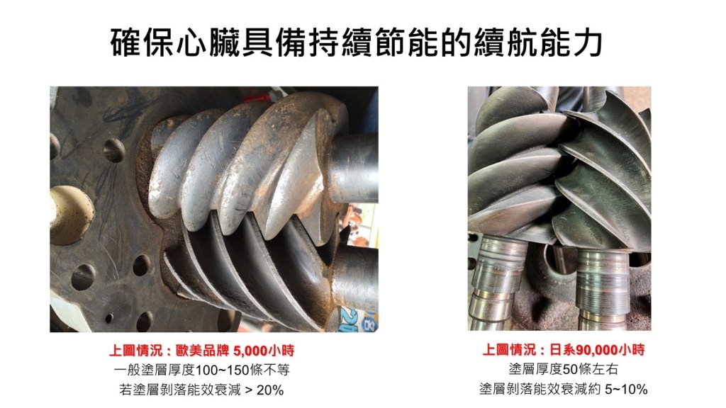 使用專利塗層與特殊鋼材質取代常見較不耐高溫與水氣的塗層與碳鋼, 並將塗層的厚度控制在50條以內, 比一般的100~130條精密; 運轉過程中, 專利塗層與特殊鋼結合不容易受到壓縮過程產生的高溫與水氣影響而剝落 (參考下列右圖), 與一般設計剝落產生的間隙不僅讓效率衰減超過15%以上, 更容易造成轉子鏽蝕損壞. 這就是為什麼日本神鋼乾式無油雙螺旋式空壓機的機體第一段壽命可以超過9年, 第二段機體壽命可以超過6年 (以年運轉8,000小時為基準) 的原因.