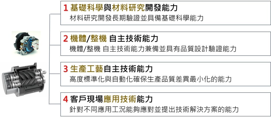 - 自主技術工廠 : 基礎材料研究與開發能力 (請參考下圖日本岩田無油渦卷式空壓機高分子密合材料), 機體自主設計開發能力, 精密加工工藝技術以及高度自動化組裝工廠. (多數世界級日系空壓機廠商與少數歐美領導品牌具備此等級)