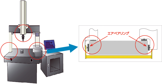 由於加工技術的日趨精密, 因此在生物醫學 (Biomedical) / 精密電子 (Electronics) / 航太科技 (Aero Technology) / 能源技術 (Energy & Power) / 精密加工 (Precision Process) …等行業都需要使用三次元量測儀器來設計以及量測擬產出的產品. 三次元量測功能的座標量測儀(Coordinate Measuring Machine, CMM), 由於許多三次元量測儀器為了提升精準程度以;及加速量測的效率, 所以儀器設備內都會設計有空氣軸承 (Air Bearing; 請參考下圖) 與空氣軸承在三次元量測儀器的位置, 讓精度以及效率做更好的提升.