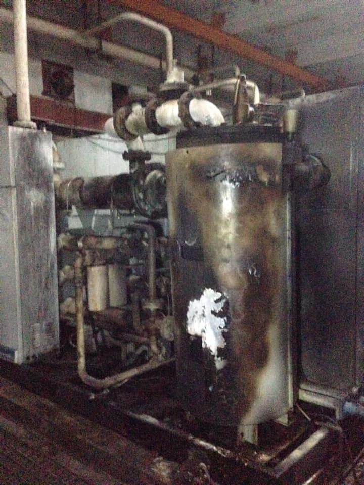 有油式空壓機 (往復式、渦卷式或螺旋式) 都可能因為上述流程圖中的管路接頭襯墊或O型環老化造成漏油汙染環境 (下圖);當然也可能因為油氣逸散出管路流程瀰漫整個空壓機內部與隔音罩泡棉經年累月的積累,造成接觸電器產生火災的工安事故,也容易造成工作現場人員滑倒的工傷事件 (下下圖)。