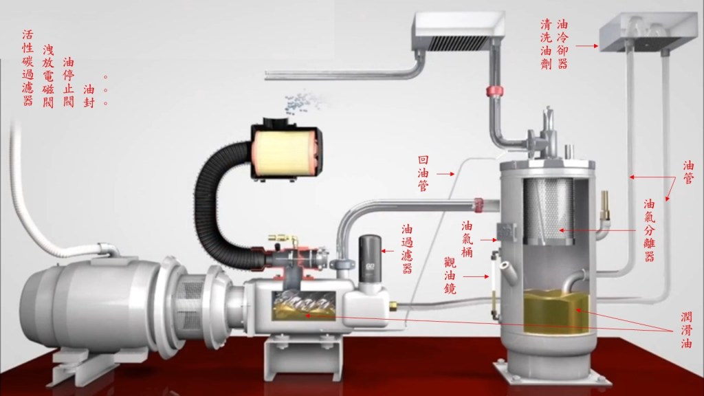 上圖是一張有油螺旋式空壓機內部的流程圖,筆者將涉及潤滑油相關的零件部品用紅色的字呈現出來; 當然也有部分沒有說明的,例如:為了增加油路流程、共用台Common Bed與隔音罩的尺寸必須放大才能安裝在機器內、控制器的機板也必須增加油路控制的元件…;又例如 : 有油渦卷式空壓機雖然沒有較大的油氣筒安裝油細分離器降低潤滑油氣跑出空壓機外進入空氣管路內,但是減少了油細分離器卻增加了油氣汙染環境。
