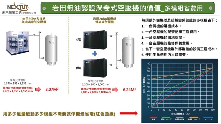 集中供氣最大的優點是節省資本支出與維持較小的佔地空間; 當然, 通常多數集中供氣需要備機的設計,但是日本岩田多模組無油渦卷式空壓機7.5馬力以上機型就有雙模組到多模組的設計,一台空壓機也能夠免去需要備機的困擾以及透過模組均等磨潤控制延長服務時間跨距,是目前在日本深獲採用的原因之一。