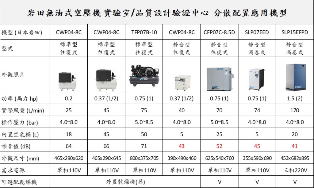 岩田無油式空壓機是日本新藥實驗室及高科技實驗室第一品牌,應用在分散式空壓機系統配置的空壓機種類有 :