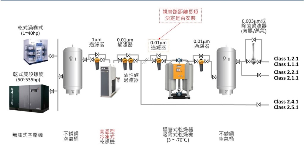 每一類型實驗室或者是實驗室每一個區域的壓縮空氣品質需求不見得都一樣,因此在冷凍式乾燥機後面的0.01um的過濾器之後可以依據實際需求,在進入該區域之前配置合適的各種乾燥裝置或過濾裝置,以求達到空氣品質規範又能夠節省成本。