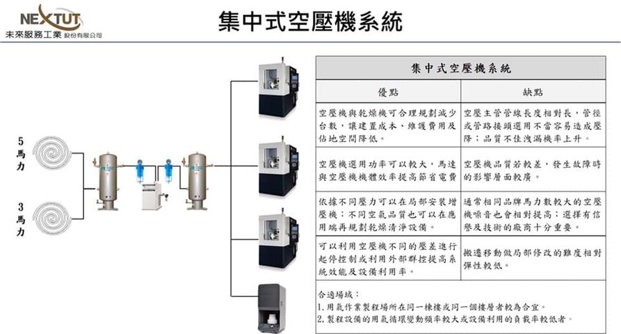 這樣的集中供氣配置方式可以節省不少的佔地空間與配管的工程,如果目前使用分散式空壓機系統配置且使用多台空壓機來應對不同設備或不同區域時。