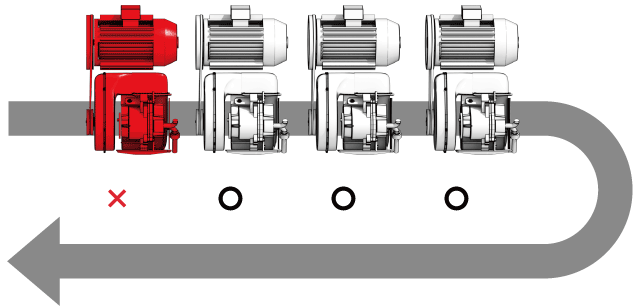 - 需求9馬力風量時,個別啟動2個模組10馬力、2個模組15馬力及1個模組10馬力。
