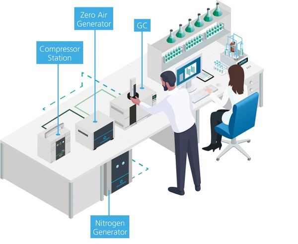 在實驗室中,需要使用氣體發生器來現場生成氣體。例如,由於實驗室應用對壓縮空氣的要求非常高,因此空氣的潔淨度和乾燥度必須非常高,所以需要無油壓縮空氣。