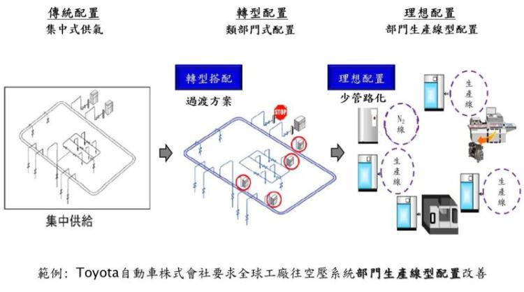 小區域集中供氣或者系統低壓化搭配局部增壓成為日本節能的領先手法,也因此日本神鋼推出的螺旋式空壓機能夠在壓力低減之後增加風量,日本岩田無油往復式空壓機也具有這樣的特質。小區域化集中供氣與分散式配置則附帶結合部門自主管理及時減量、成本中心與彈性快速復原或專案改善快速修改…等優勢,正在逐步發酵中! 空壓機系統低壓化是節能減碳的利器,歡迎各位前輩下載應用!