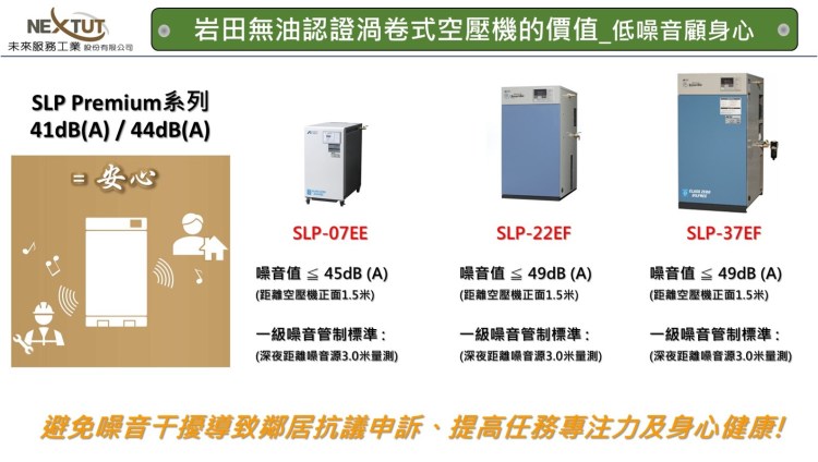其中靜音型無油往復式空壓機CFP-D系列與無油渦卷式空壓機SLP-D系列為能夠更接近使用現場,除了運轉噪音低減成為全球最低噪音的領導之外,內置乾燥機的機型更是考慮科研實驗室與科技廠辦空間需求的強度所設計出來的