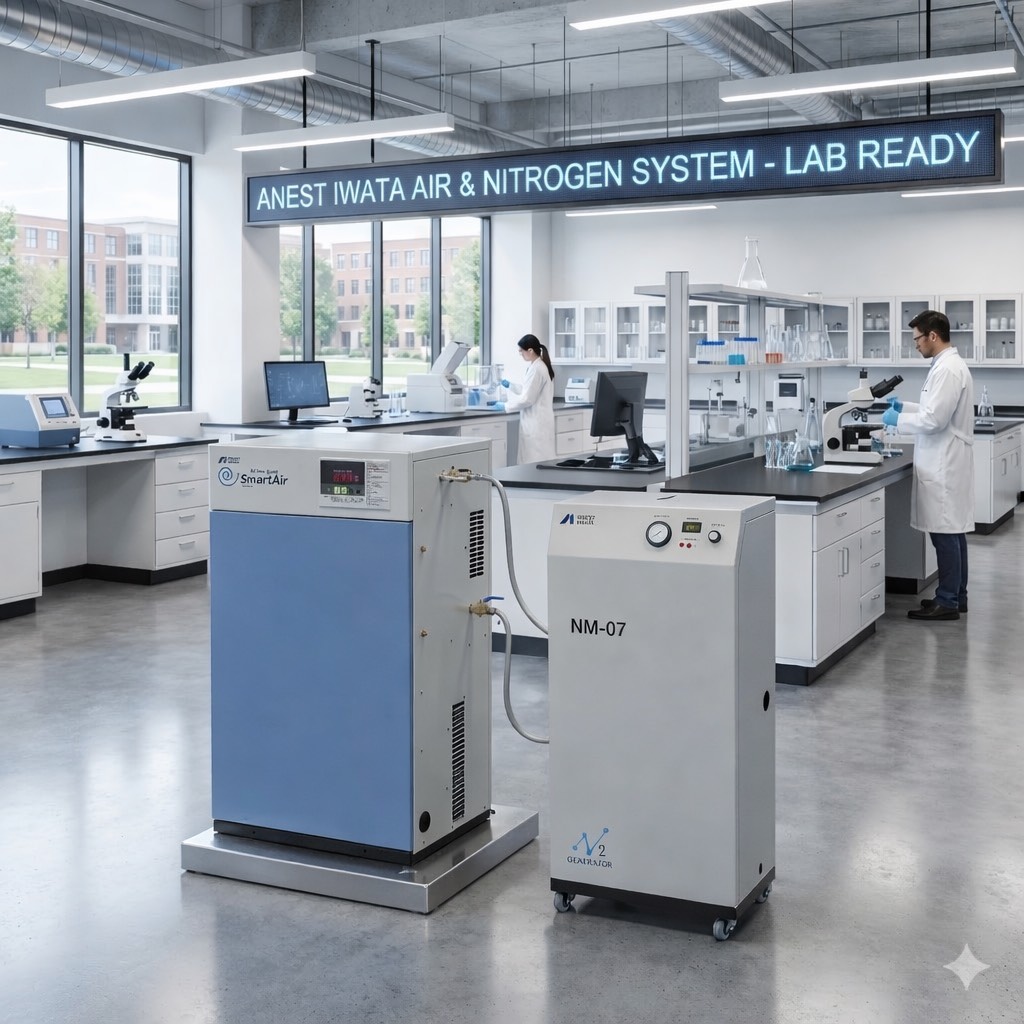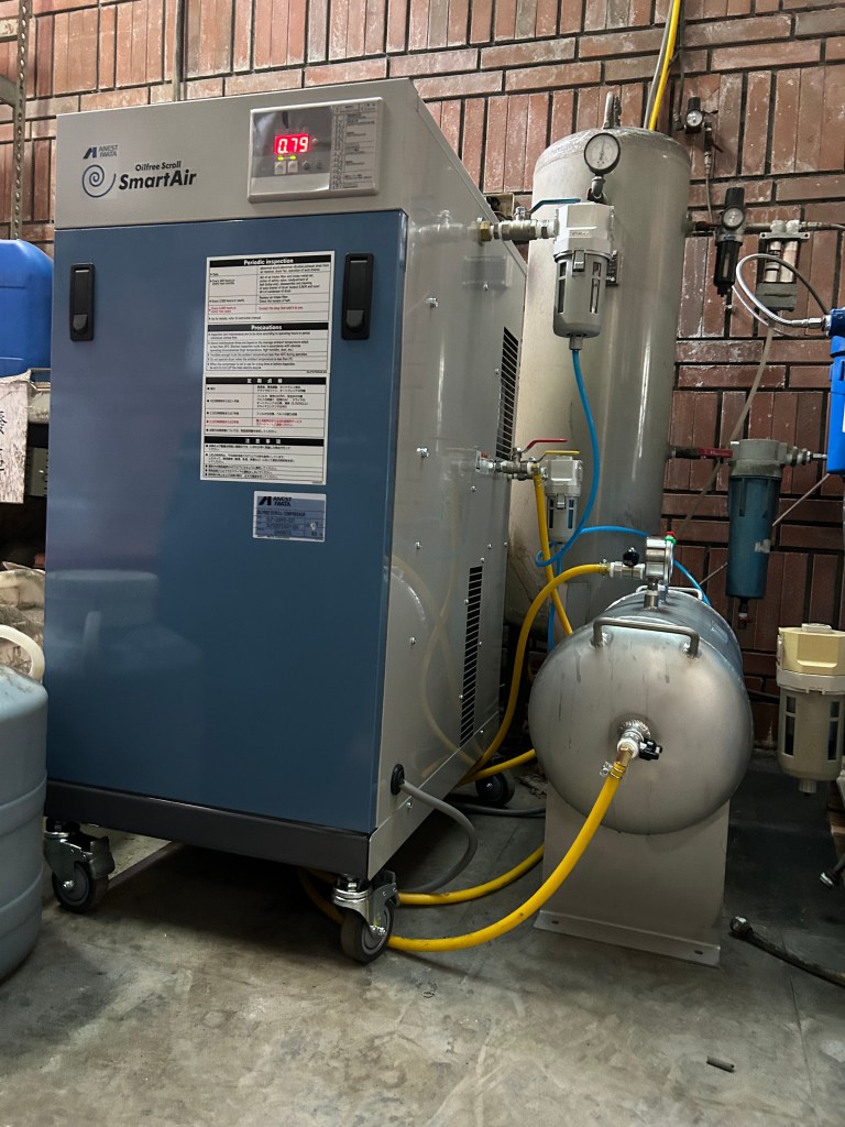 - 日本岩田(Anest Iwata)無油渦卷式空壓機: 這是全球首創且領先的技術。其具備 ISO 8573-1 CLASS 0 無油認證,低震動、超低噪音(50dB 以下),非常適合放置在對環境要求嚴苛的實驗室內部。