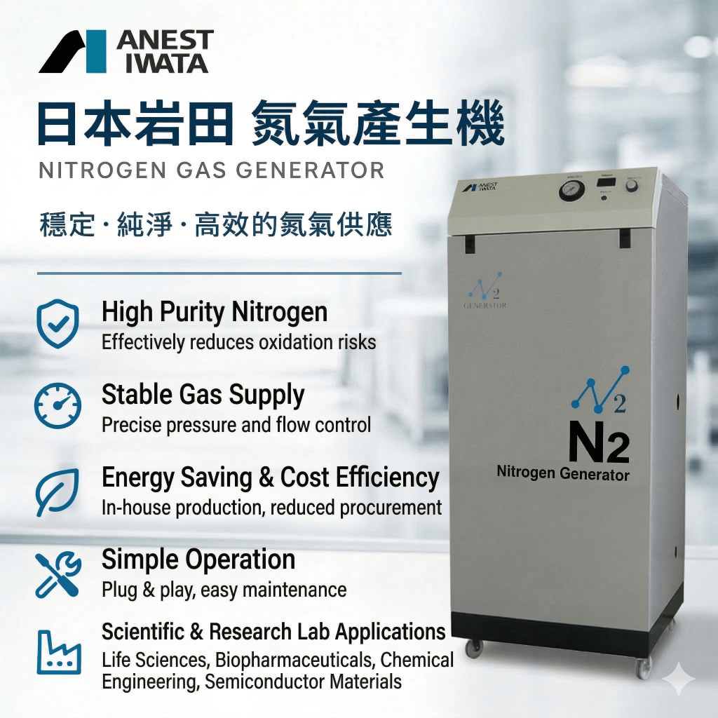 日本岩田氮氣產生機可由周圍空氣分離產生氮氣,免除鋼瓶依賴,並可依實際需求提供所需氮氣量;其應用可涵蓋生命科學、生醫製藥、法醫毒理、化學化工以及半導體材料…等實驗室與研究機構領域。