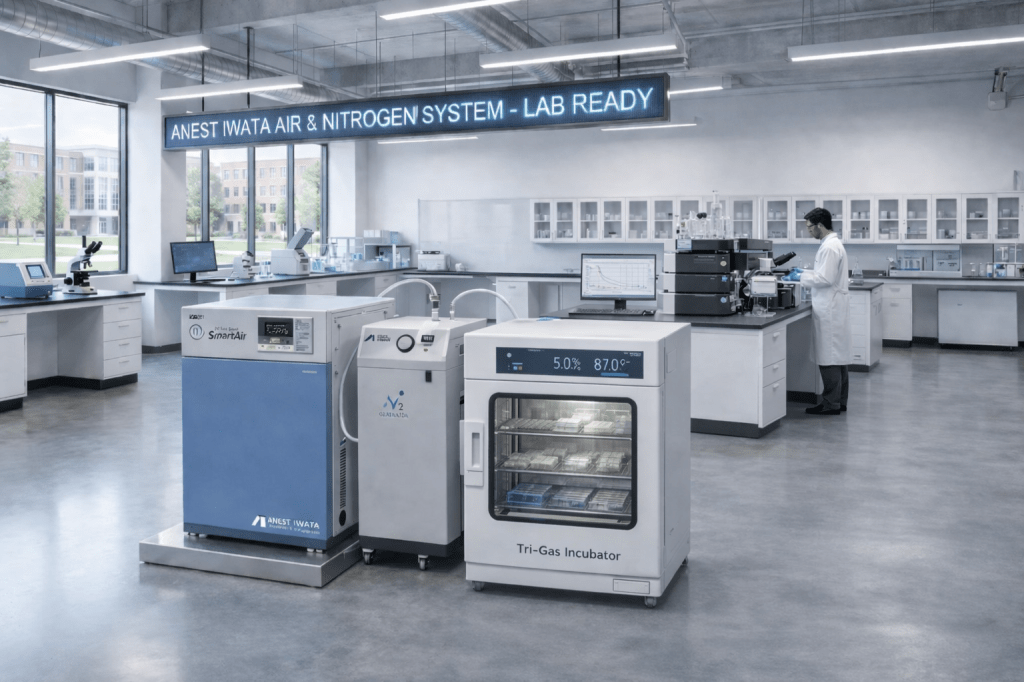 總結來說,三氣培養箱真正需要的,不只是把氧濃度「調得到」,而是把低氧環境「維持得住」。鋼瓶模式可以解決供氣來源,但未必能長期解決穩定性、管理效率與中斷風險;而 N₂ 產生機搭配無油 CDA,則更接近現代實驗室對可持續、可控與可管理基礎設施的期待。ANEST IWATA 的氮氣產生裝置強調按需供應、免鋼瓶管理,渦卷式空壓機則強調 clean air、低噪音與低振動,這樣的組合特別適合對環境穩定度要求高、又不希望研究節奏被鋼瓶管理拖累的生命科學場域。