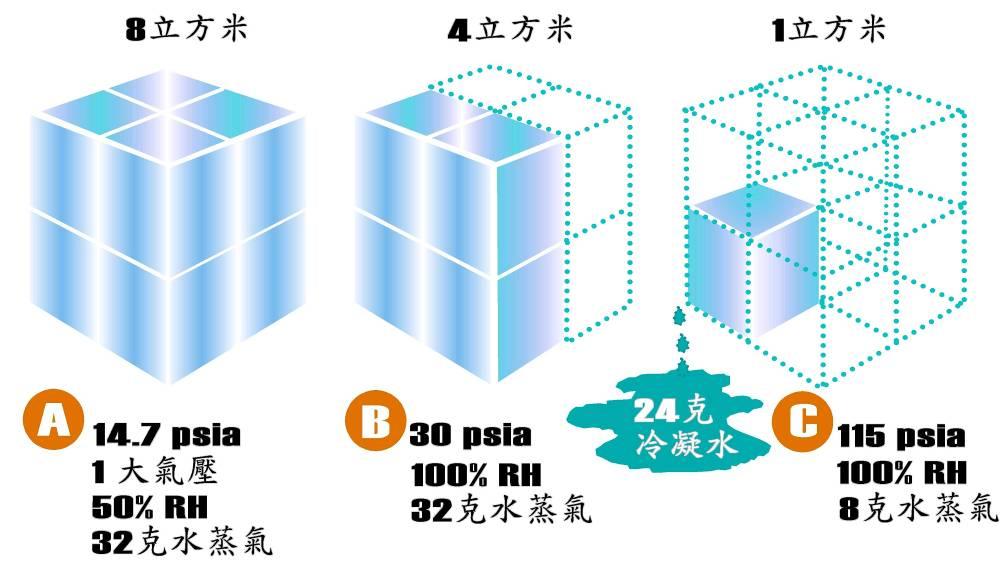 怯水器或怯水裝置主要是在壓縮空氣的過程空氣中的相對濕度水氣,在空氣經過壓縮之後體積縮小,但是液體無法被壓縮而讓體積縮小的壓縮空氣過飽和現象而讓隱形的水氣變成顯形的冷凝水 (請參考下圖)。