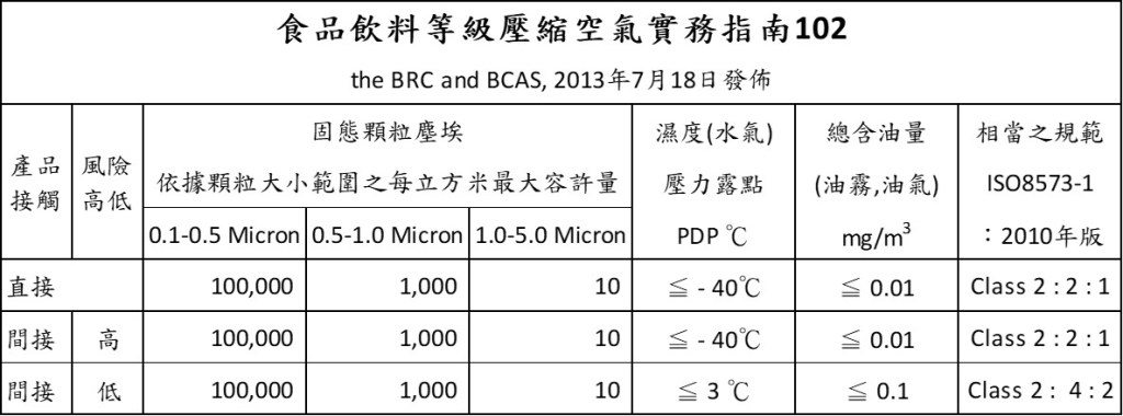 而不同的行業則也會依據自己製程產品或者是提供的服務的要求,形成不同行業對於壓縮空氣品質的要求;例如:許多行業就會針對壓縮空氣是否會接觸到產品 (直接接觸或者是間接接觸) 而建立一些行業壓縮空氣品質指南,下方表格即是英國BRC與BCAS提出的指南102,德國VDMA也有類似建議指南。而生醫製藥行業與高科技行業 (如:半導體廠) 則會有更嚴謹與更嚴苛的行業標準規範,主要是涉及到高科技廠房產品製程是否會受到汙染、儲存或運輸過程在經緯度不同的地區是否會造成品質問題而訂定出行業標準。
