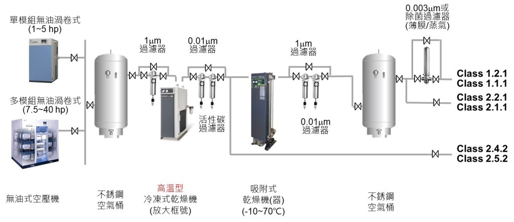 精密儀器如果有使用到壓縮空氣,那肯定會有入口+流道+電磁閥件+關鍵部品+出口, 任何一處遭受汙染難免影響精度,因此許多精密儀器都會制定類似下表的壓縮空氣品質建議!