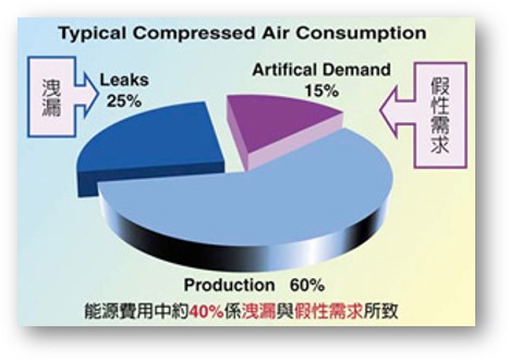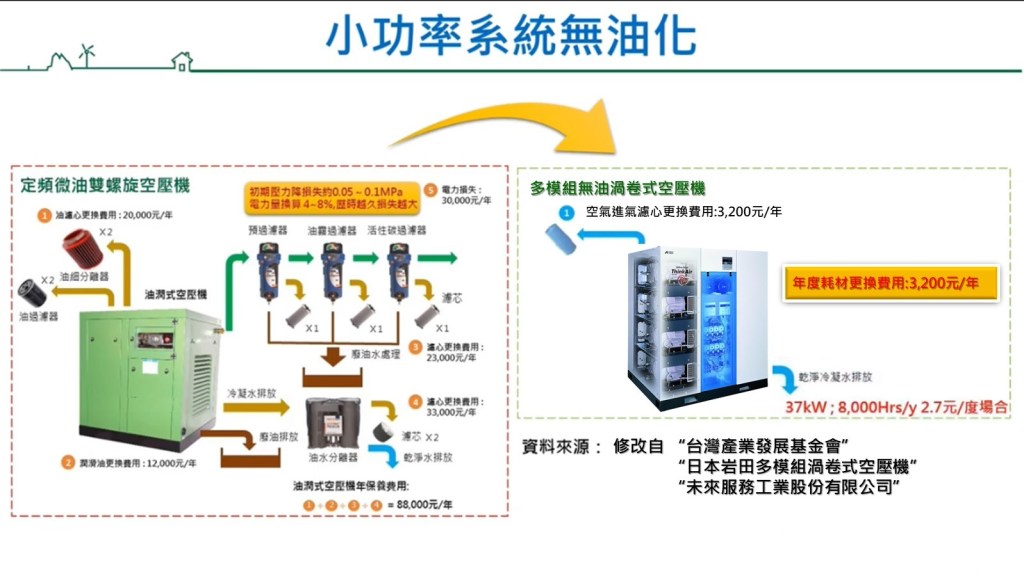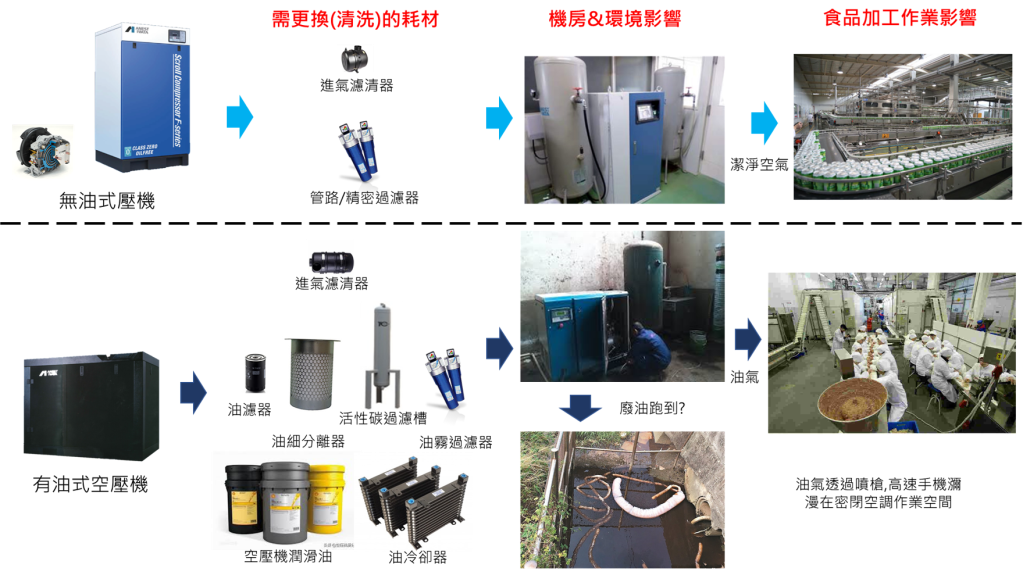 少數藥廠或高科技廠房空壓機系統設計採用有油式空壓機設計, 然而食品飲料GMP工廠採用有油式空壓機系統的比例卻超過80%以上; 大多數此類工廠會採用多重過濾的方式試圖攔阻或擄獲來確保固態顆粒, 壓力露點, 含油量以及微生物. 事實上, 以含油量來觀察, 透過多重過濾裝置來克服有油式空壓機帶出來的油份是有其現實的困難的, 而且更換過濾耗材的費用也是一筆開支!