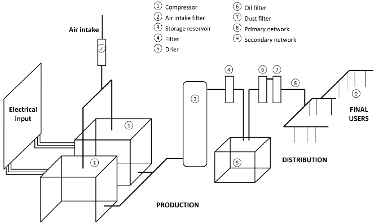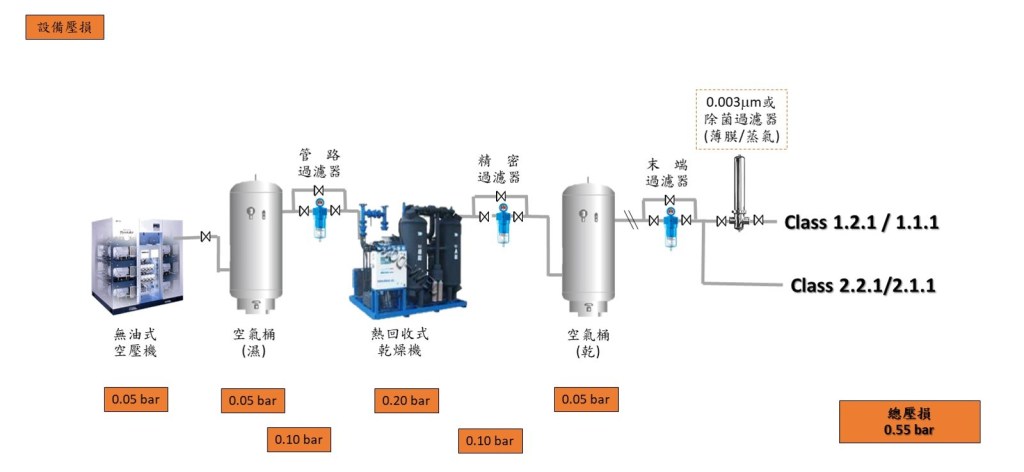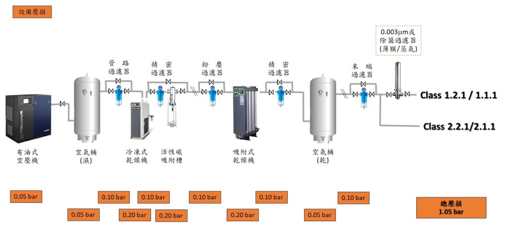 空壓機系統依據現場需要的壓縮空氣品質需求規範 (ISO 8573-1; 如下圖) 為基礎來設計的, 其中最基本的包括: 空壓機, 乾燥機, 儲氣桶, 過濾器, 排水裝置, 管路與各式閥類彎頭.