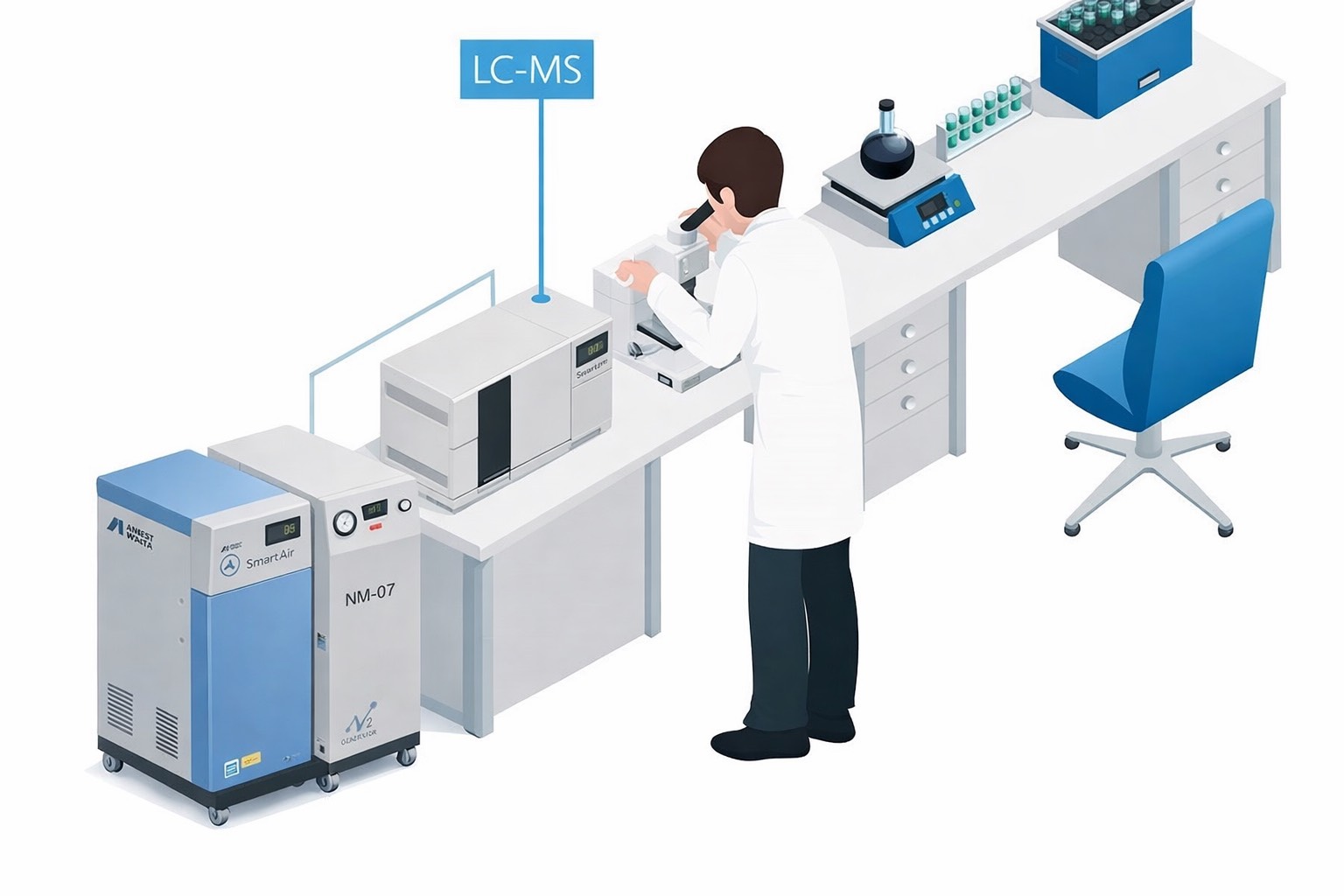 應用場景: 搭配 ANEST IWATA 無油渦卷式技術 ,可提供極度純淨的 CDA 給予氮氣產生機(N2 Generator),保護其分子篩免於油污染,大幅延長昂貴儀器的使用壽命。