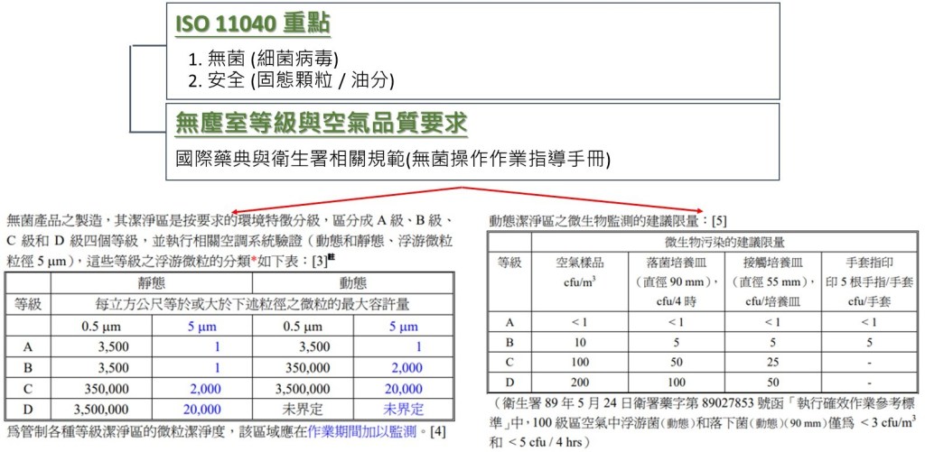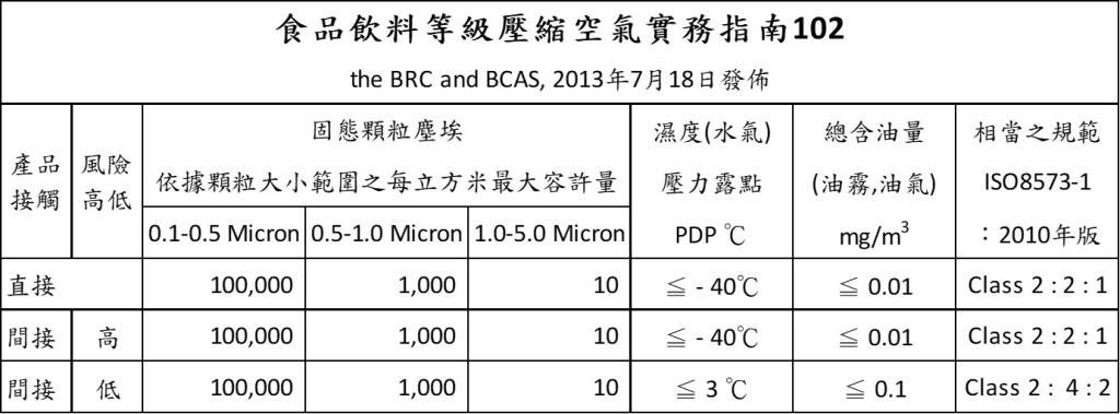 實務上,生醫製藥廠或新藥研發實驗室會依據生產或開發的環境製程、區域是否有獨立分開以及人員在各區域之間流動的頻率,會去制訂不同製程區域或作業區域採用不同等級的壓縮空氣品質。例如:健康食品生產廠區或研發實驗室可能會依據 Class 2.4.2. 甚至採用有油式空壓機系統再加裝過濾裝置;而藥品工廠又區分為外用藥膏、食用膠能/藥錠或侵入注射的針劑/疫苗依據藥典或行業規範或技術經驗設定不同等級的壓縮空氣品質規範。