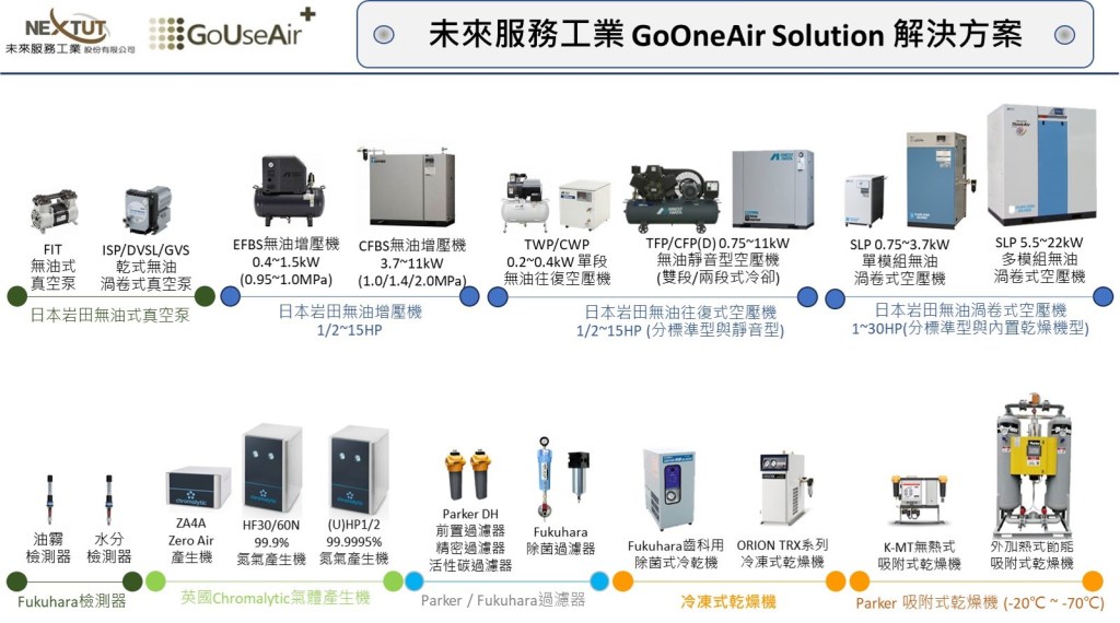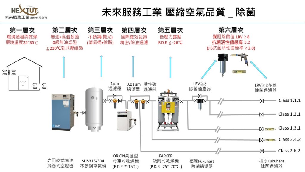 特別是在生醫製藥實驗室,未來服務工業 GoUseAir Service 服務套裝組合為滿足符合「無菌壓縮空氣」的規範要求,未來服務工業除了下列的長期租用套裝組合服務還會增加提供一組全球業界第一家上市推出的「日本福原Fukuhara除菌過濾器」(除菌效果日本政府驗證LRV>8;除菌活性2.1~5.2)。