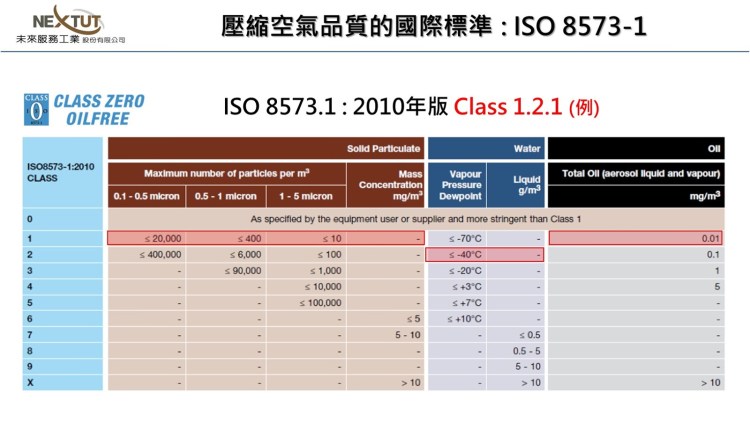 壓縮空氣品質要求至少達到ISO 8573-1 Class 1.5.1,能夠達到Class 1.3.1則是最佳的狀態 ;也就是說,固態顆粒大小 < 0.01µm、水氣含量壓力露點 7℃~-20℃、油氣含量要求 < 0.01mg/m3 以上。專業的空壓機系統廠商必須規劃能夠符合並滿足上述需求產出的壓縮空氣規範,以確保氮氣產生器系統能夠滿足高能效與壽命要求。