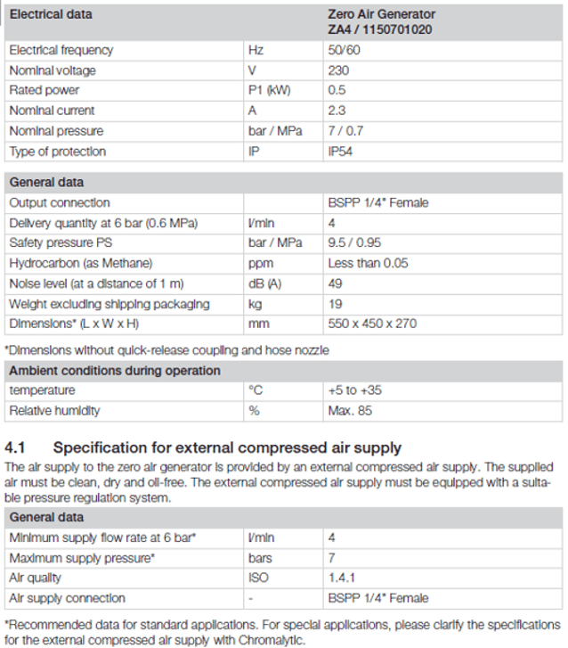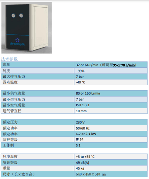Chromalytic克洛瑪麗緹有兩個種類並各有流量 1 L/min. 與 2 L/min. 的 (U)HP1 與 (U)HP2 機型純度可以達到99.9995%的氮氣產收器,規格表如下。