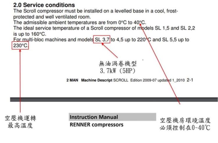 至於輕工業型無油渦卷式空壓機的主要特徵包括:過載使用馬達、實際風量相對工業級少20~30%、機體壽命 < 20,000小時 甚至 < 15,000小時;我們下面舉ㄧ個從大陸進口無油渦卷式空壓機機體組裝的品牌來分析(中國通常模仿能力很強,技術與品質部分則須要看產品類別而有所不同):