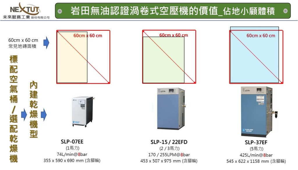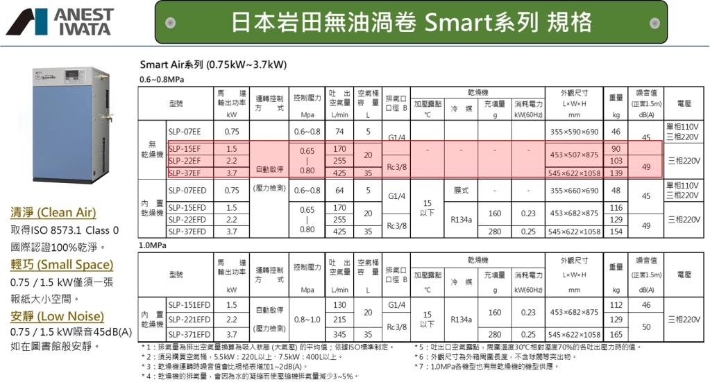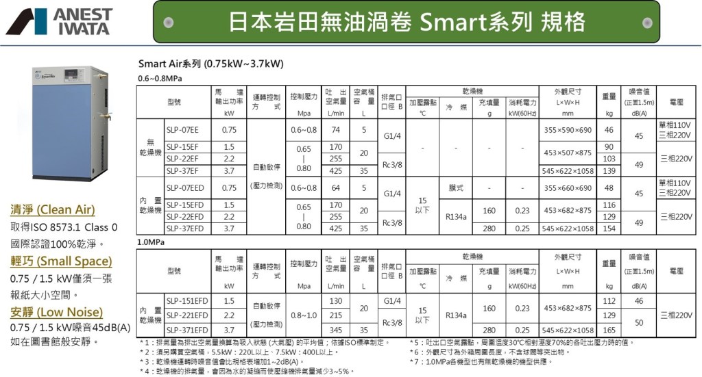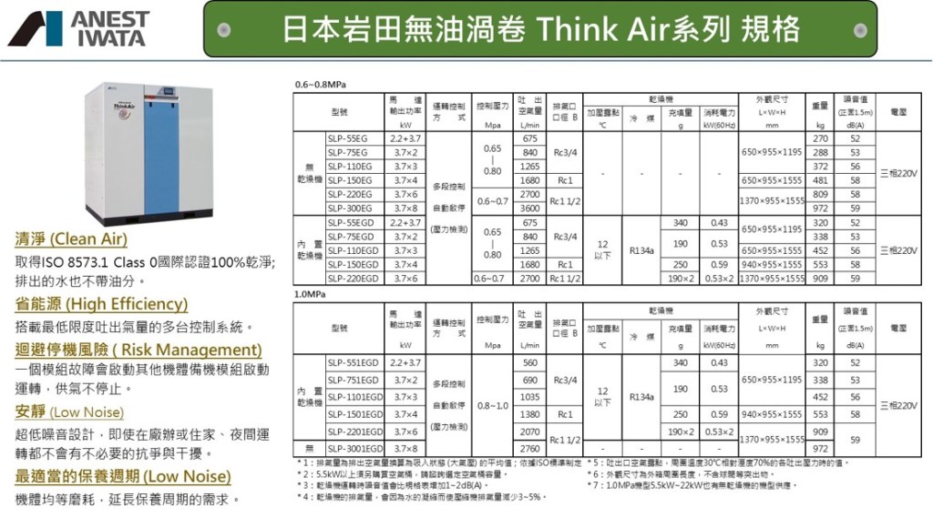 如果仔細研究無油渦卷式空壓機可以發現有兩類型式的系列:工業級 與 輕工業型;我們先來看看工業級的日本岩田無油渦卷式空壓機的技術資料 (如下)。