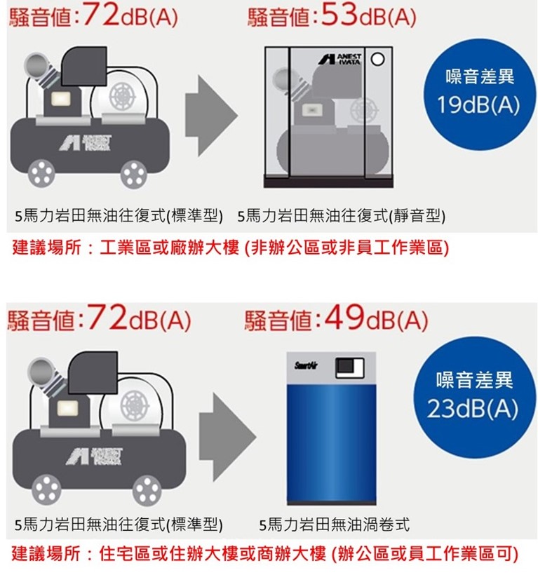 - 三馬力無油渦卷式空壓機:實際風量180L/分鐘 @ 8.0 bar (實際風量相當於岩田二馬力,噪音值57dB;較岩田三馬力高出8分貝),風量較岩田約少30%。其IE3高效率馬達並非標配而是選配。
