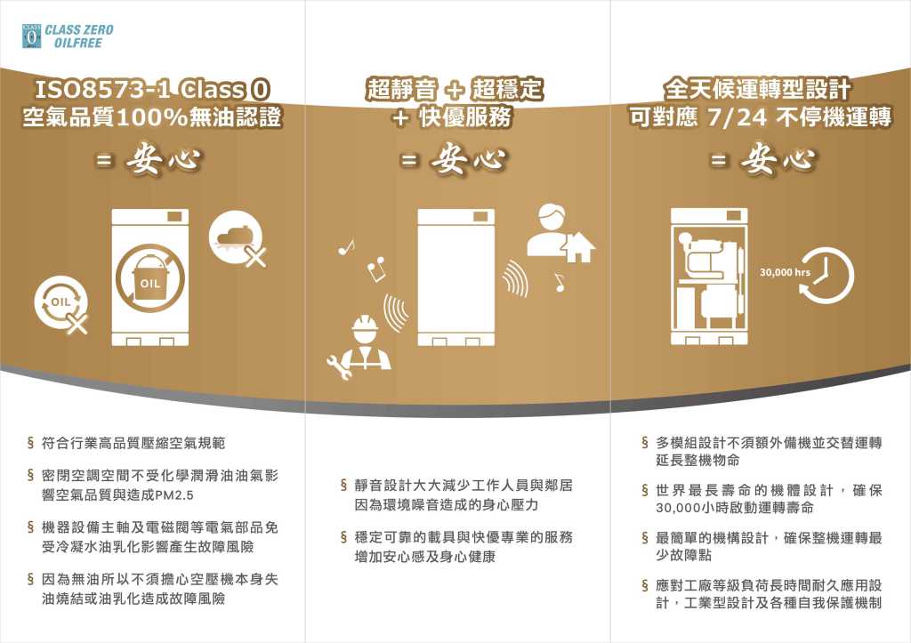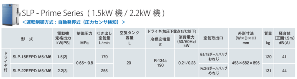 - 三馬力SLP22EF空壓機:實際風量255L/分鐘 @ 8.0 bar (噪音值45dB);機體壽命 ≧ 30,000小時。(全系列採用日本Top Runner認證的東芝Toshiba高效率全密馬達)