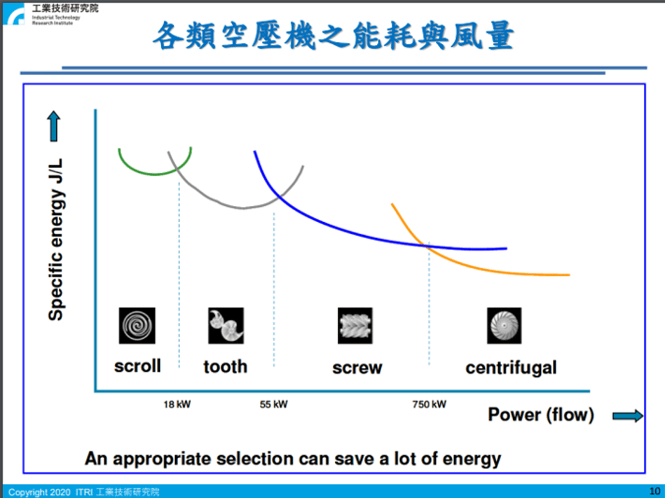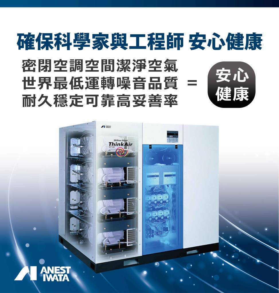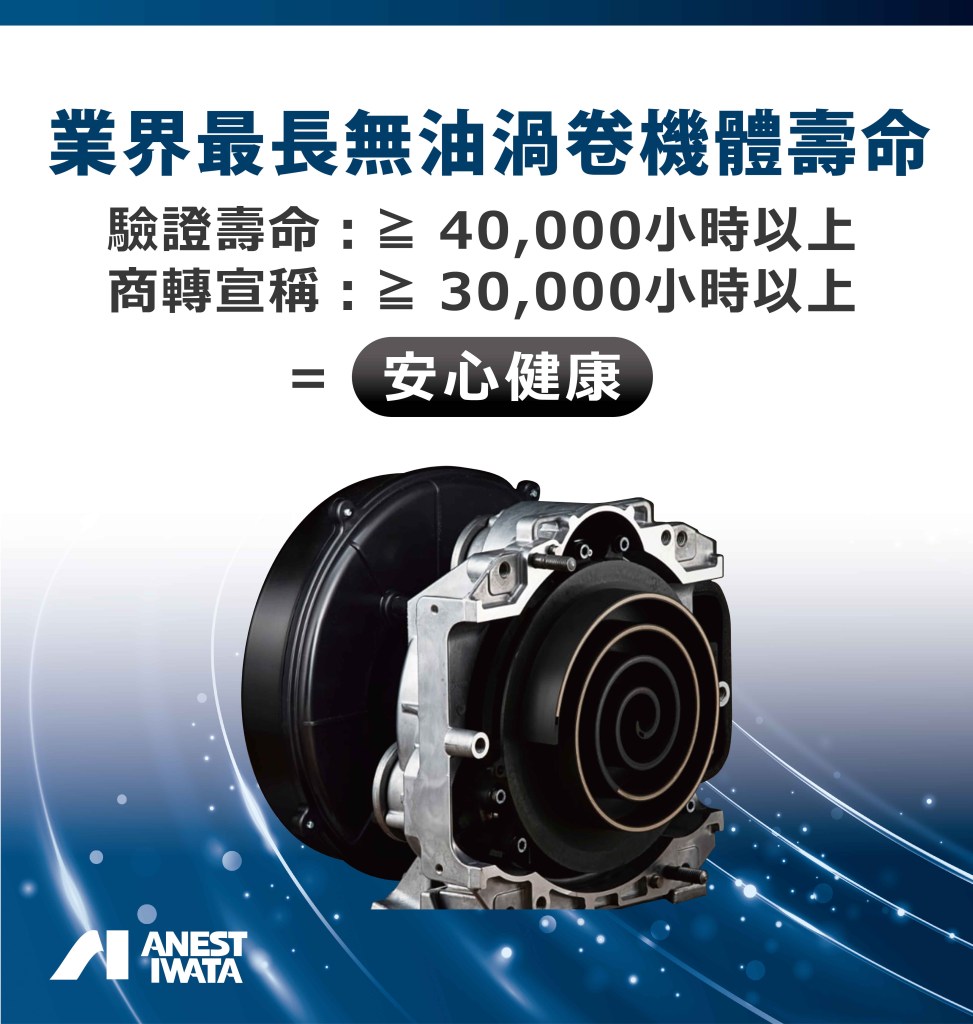 依據工研院的研究指出18kW (含) 以下能效最高的就屬於渦卷式空壓機,而日本岩田則是全球第一家上市的無油渦卷式空壓機的先行者,同時也是全球壽命最長的無油渦卷式空壓機機體壽命品牌!