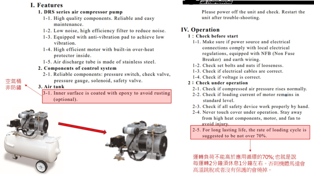目前科研實驗室常見的無油式空壓機多屬於商用型空壓機,通常無法持續不停地運轉 (因此會在一台空壓機設計兩個商用型機體馬達模組),如果沒設計保護裝置則經常會過載運轉燒毀。以上面第二個與第三個實際範例的Duty Cycle與機體壽命資料來看,為避免機體高溫燒毀每運轉30~40分鐘的時候就需要停下來15~20分鐘讓機體降溫,如果持續運轉也可以,只是機體壽命會快速縮短或者非預期燒毀。如果打開空壓機的隔音罩,機體通常就是下列的型式。