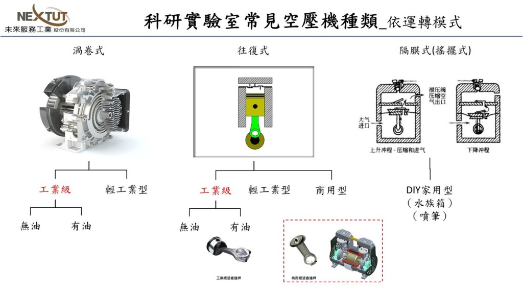 目前台灣獨立型的科研驗室場所常見的空壓機種類區分如下: